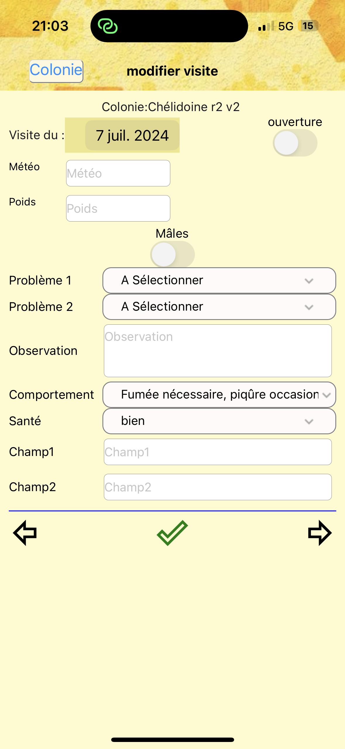 - l’écran de détail de la visite (on y arrive en appuyant sur la synthèse de la visite - écran liste visites ou colonie)