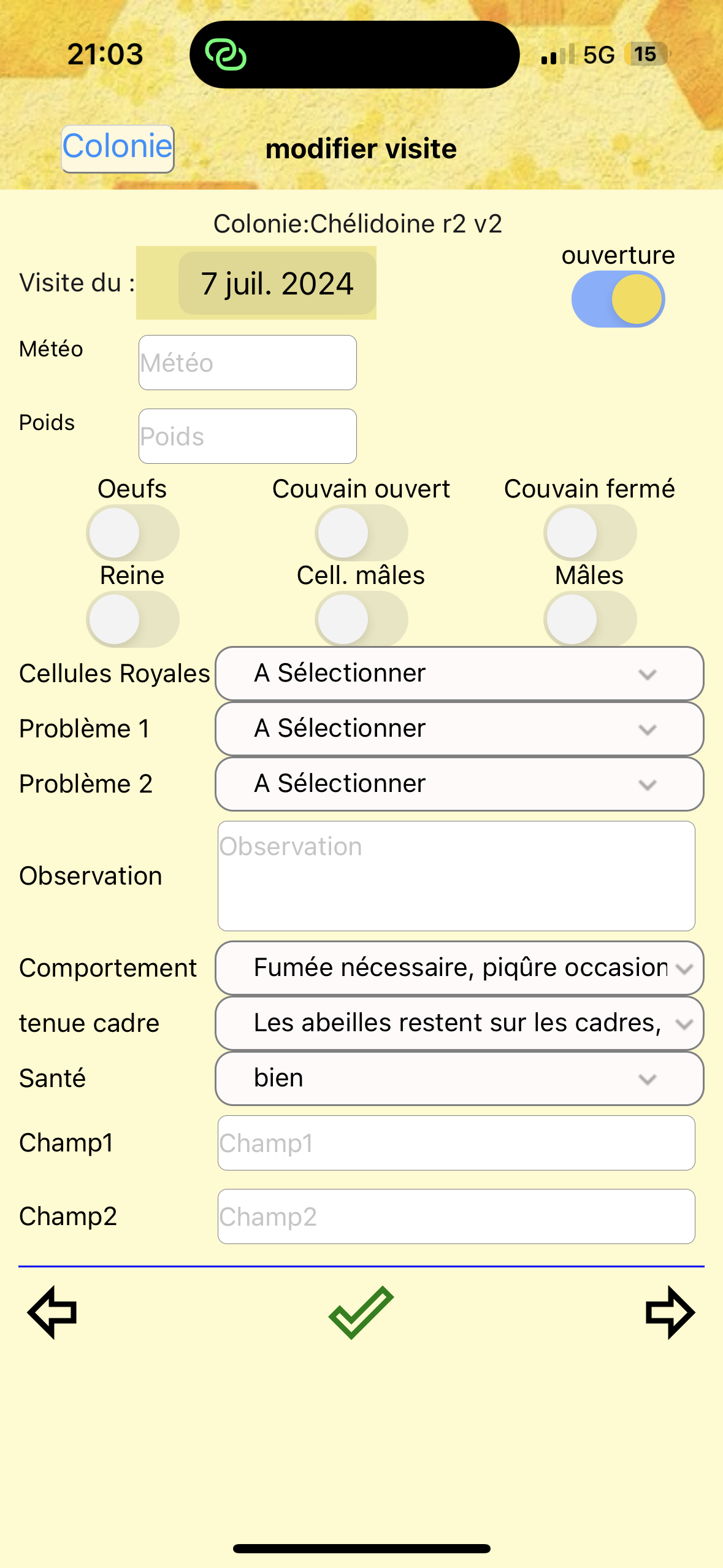 ouverture indique si la ruche a été ouverte. L’actionner dévoile les boutons sur les œufs, le couvain, la tenue au cadre et la reine)
